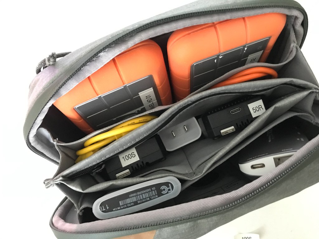 On this short spring trip, I will also be working on nailing down my iPad workflow and getting any last kinks worked out as we do not plan on taking a laptop with us on this vacation, nor any future ones this summer. Even though we had the iPad with us last summer when in Colorado, we also had my Macbook Air and that was the primary machine for uploading/editing/emailing images. The iPad was used for movies, and the occasional email and social media uploads. On this trip, I will be working with the iPad Pro exclusively plus my Satechi adapter for uploading my camera and drone SD cards; an external 1TB SSD Samsung T5 drive as my iPad Pro even with 512GB of storage needs some additional help in the storage area, plus two older, and larger (see photos) 1TB LaCie Rugged drives. I’ll be testing the Lacie drives during this week long trip in order to make sure they function properly; they are older drives that have not been used in quite a few years. I will also be testing and checking all my cables and connectors, and the cases the gear will be transported in. The images here show the cables, external drives and other components and the bags they will be traveling in.