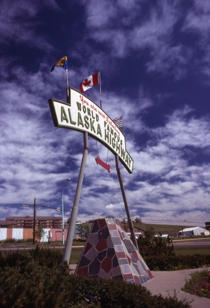 On one of several trips on the Alcan – When it was mud, gravel, and clay there was a washed out bridge. That huge gravel mover/grader back there? They hooked a chain to my Mazda and PULLED US THROUGH to the other side! That’s what the Alcan was all about back in the day!!!