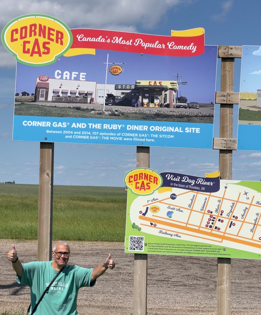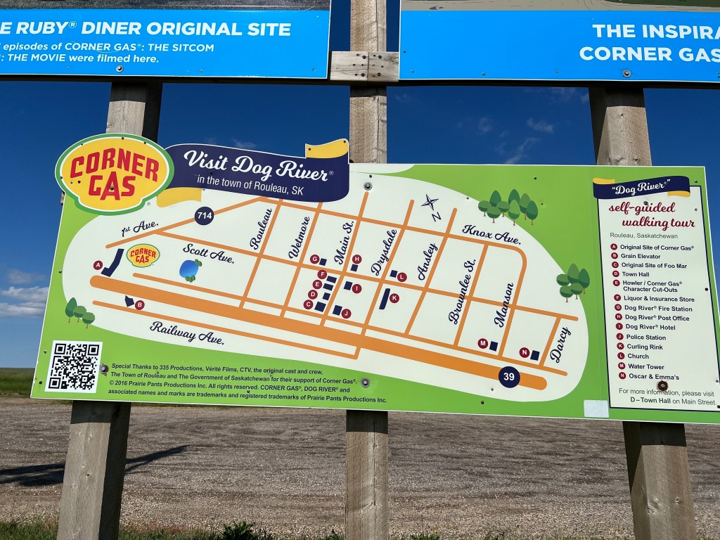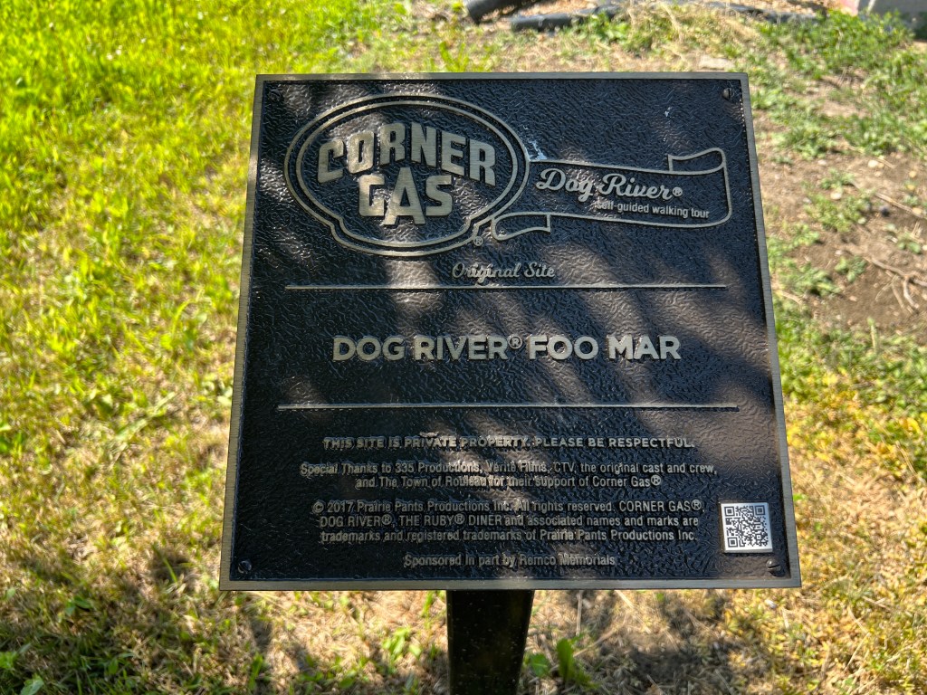 ..is a small town of 500+ residents, Rouleau boasts being the setting for the sitcom, Corner Gas, currently on Amazon Prime. I have never watched the show, but my husband has seen it twice, so he had to visit the town. Many of the buildings used were actual town structures and are still there, such as: the liquor and insurance store, the Dog River Post Office, The Dog River Hotel and Bar, the curling rink, the church, the Howler newspaper office, and Oscar and Emma’s home. Places no longer there were: the grain elevator, the police station, and the ”Foo Mar” which did have a plaque showing where the facade or building originally stood. On the outskirts of town, is the spot where the actual gas station and The Ruby (restaurant ) were located. All that remains now is this sign. If you are driving through Saskechewan and are a fan of the show, it is a fun spot.