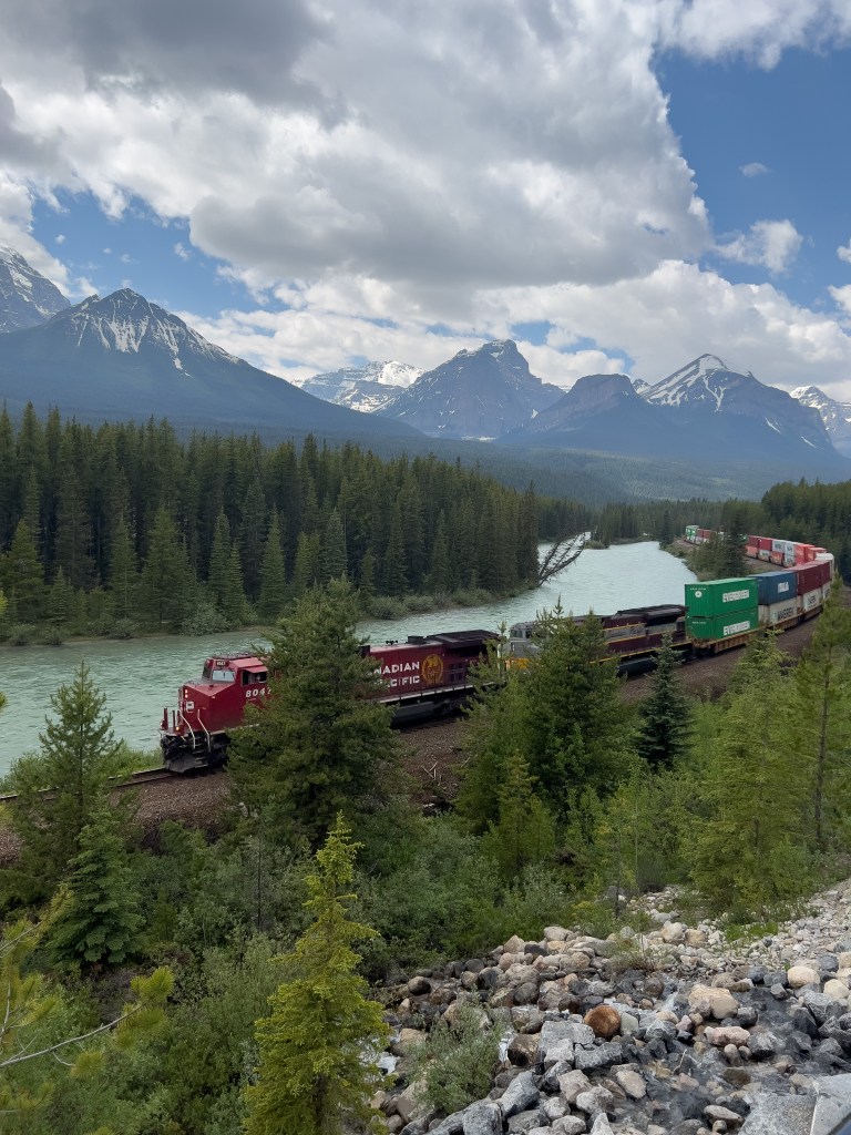 I will share the first picture I took of many, but this one took my breathe away. I may have to do a whole blog just for Banff because that is a trip that if you have the opportunity, you should try to put it on your bucket list of places to visit. One of the stops, my husband wanted to try and capture was Morant’s Corner and the epic train photo. We got there and there were other people milling around. The question asked as new folks arrived was, ”Does anyone know what time the train travels past here?” No one knew. I joked that the people who knew were probably not there for the reason that they did know the train time schedule, and it wasn’t now. . But persistence paid off, and after 40 minutes of taking in this beautiful scenery and enjoying new friends, (thanks, Heather and Karen), the long, freight train came chugging along and to the choruses of ”the train is coming,” it gave everyone the opportunity to take some great shots.