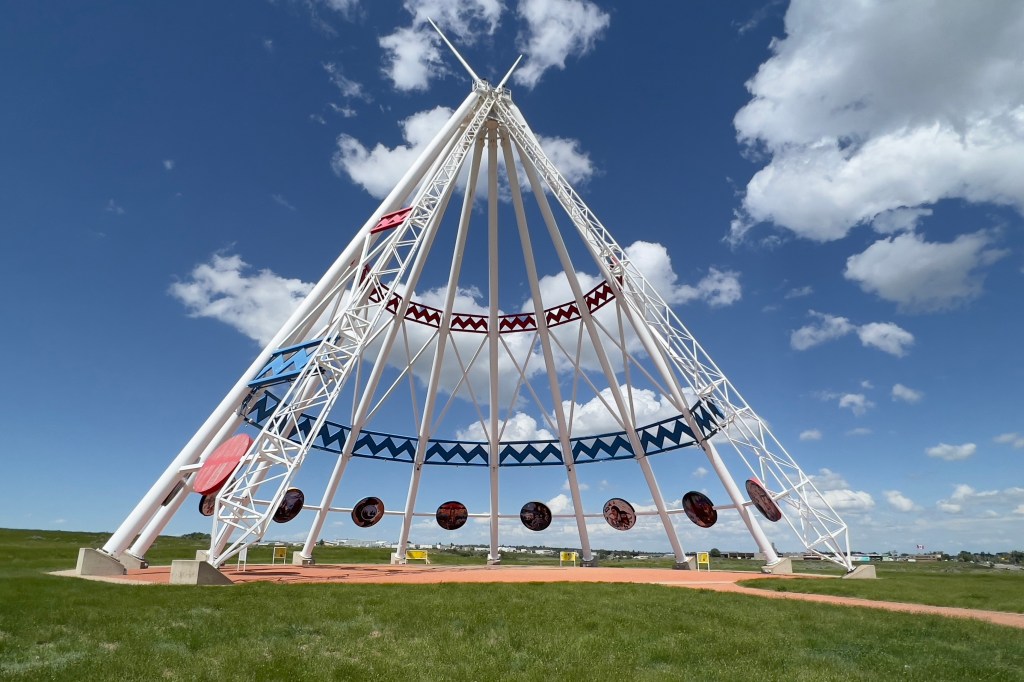 Drove through the Canadian prairies and experienced very high winds and stopped at Medicine Hat. This large city of “Hatters,” as the local resident are called, is home to the over 63,000 residents. Spent about an hour at the visitor center and walked underneath the world’s tallest teepee – 215 feet equal to a 20-story building. The Saamis Teepee was was built for the 1988 Calgary Winter Olympics and was later moved here. Its colors are: white for purity; red for the rising and setting sun, and blue for flowing water. The circle of unity embodies multiculturalism. It features a pipe representing the unity of all people and all things. The circle represents no beginning and no end; the buffalo wisdom and generosity; the eagle bravery, love and friendship. The different colored hands depict the different cultures and peoples of the world. Some are solid and some are mixed. This particular circle is dedicated to the ideals of equaity, tolerance, and understanding and to of all the rich, cultural heritage of all North America and it’s aborigInal people. It sends such a powerful message under that blue sky. You can feel the older spirits speaking to you. May all who stand under this teepee hear and feel the words and walk out a different person and remember, ”Wherever you go becomes a part of you.” Anita Desar