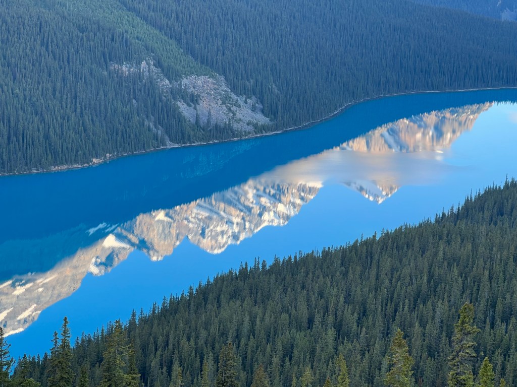 DAY 8: Woke up at 6 AM and decided to visit Peyto Lake again since we had to drive right past it. Walked the 1.5 mi trail to the lookout again, and this time we had the place to ourselves. The reward for getting there so early was witnessing the color changes in the water; this time it was the most intense royal blue you have ever seen. This is not a typical color you see in nature. The lake gets its color from the large amounts of glacier rock that flows into it in the summer.The color varies with the season and the time of day depending on the angle the sun hits it. If you have the opportunity, see it late at night and early in the morning; it will make a lasting impression.