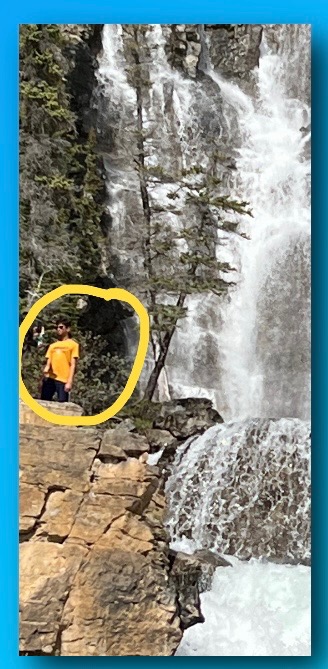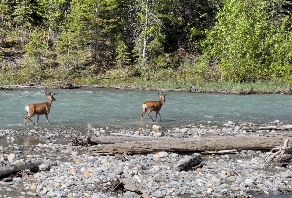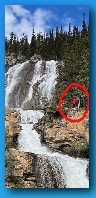 Happy Canada Day. Stopped at Petro Canada gas station in Lake Louise for the morning cup of Java to kick-start the day and this colorful employee demonstrated pride for his country. Continued on our way in Big Bertha, as my husband affectionately calls our Toyota Sienna van. Headed towards Golden, BC to see the Natural Bridge. On the way, passed the Continental Divide that borders Banff and Kootenay National Parks. Saw more glacier-water, green lakes; they are like nothing you have ever seen before. Banff is truly a photographers’ dream. Captured baby deers wading in the streams.