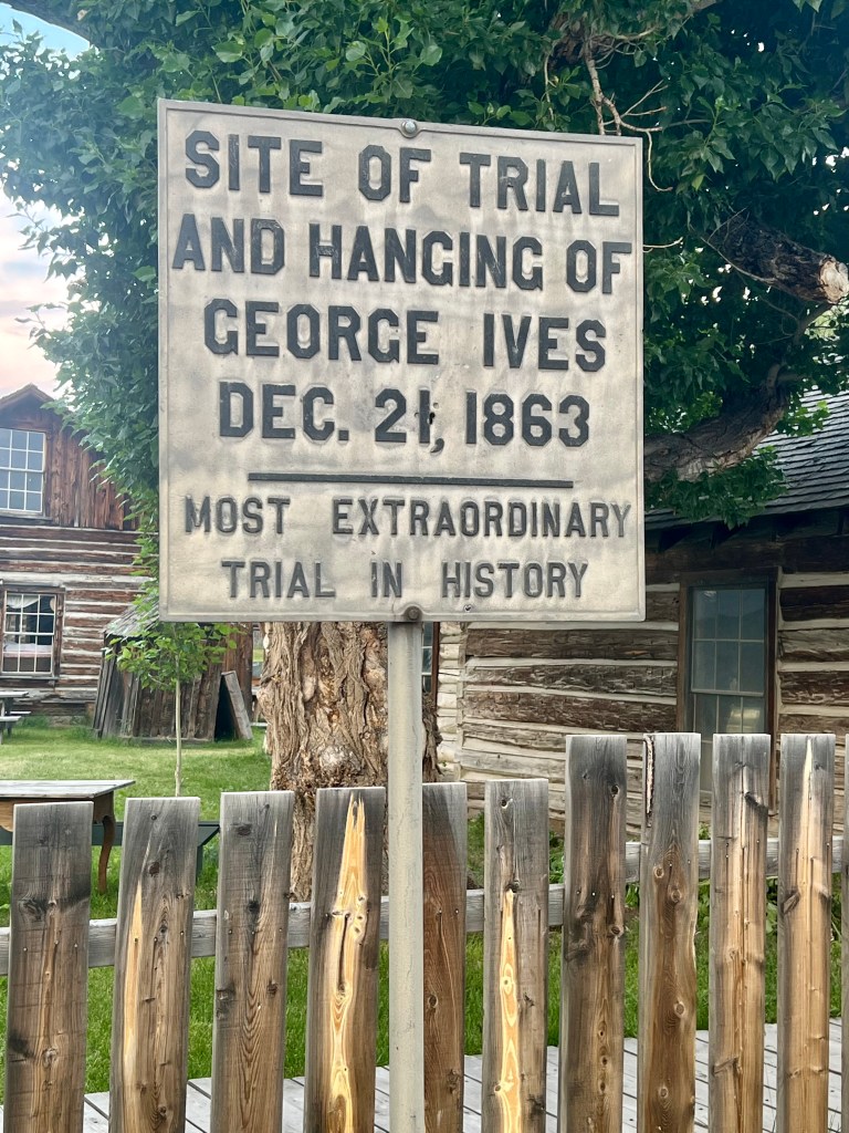 One day a dead body was discovered; he was identified as a popular, orphaned, young man between the ages of 17-22 by the name of Nicholas Tiebolt. It turns out that Tiebolt was on an errand to collect some mules. He had gold dust to pay for the livestock. Ives took his gold and then shot him. Ives was found hiding nearby and was arrested and brought back to Nevada City for trial. The jury deliberated for less than an hour and came back with the verdict of guilty by 23 to 1. After the trial, the crow was asked, “What should the sentence be?” It was important to get the matter settled quickly before Ive’s band of Highwaymen became aware of the situation. There was a short silence and then people started shouting, “Hang him!” One of the guards grabbed the rope, hung it over a beam between two cabins, and placed a box below him. When asked if he had any last words, he replied “Tell my mother I died an innocent man.” The box was kicked from under him and the spot where he was hung today has a sign. The hanging of George Ives sent a clear message to the Road Agents – the people of Montana were implementing law and order.